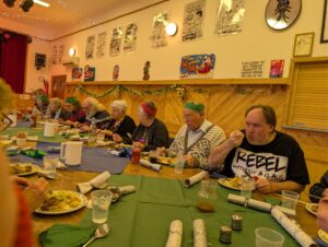 Last Thursday, 11th December, marked the final Lunch Club of 2025, held at the beautifully decorated North Roe and Lochend Hall. Guests enjoyed a festive Christmas dinner with all the trimmings including Growing Local parsnips and brussel sprouts, alongside a delicious vegetarian Cheesy Leek Bake made with Growing Local leeks. Dessert was a perfect seasonal treat — sticky toffee Christmas pudding and a traditional cheese board for those looking for something not so sweet.